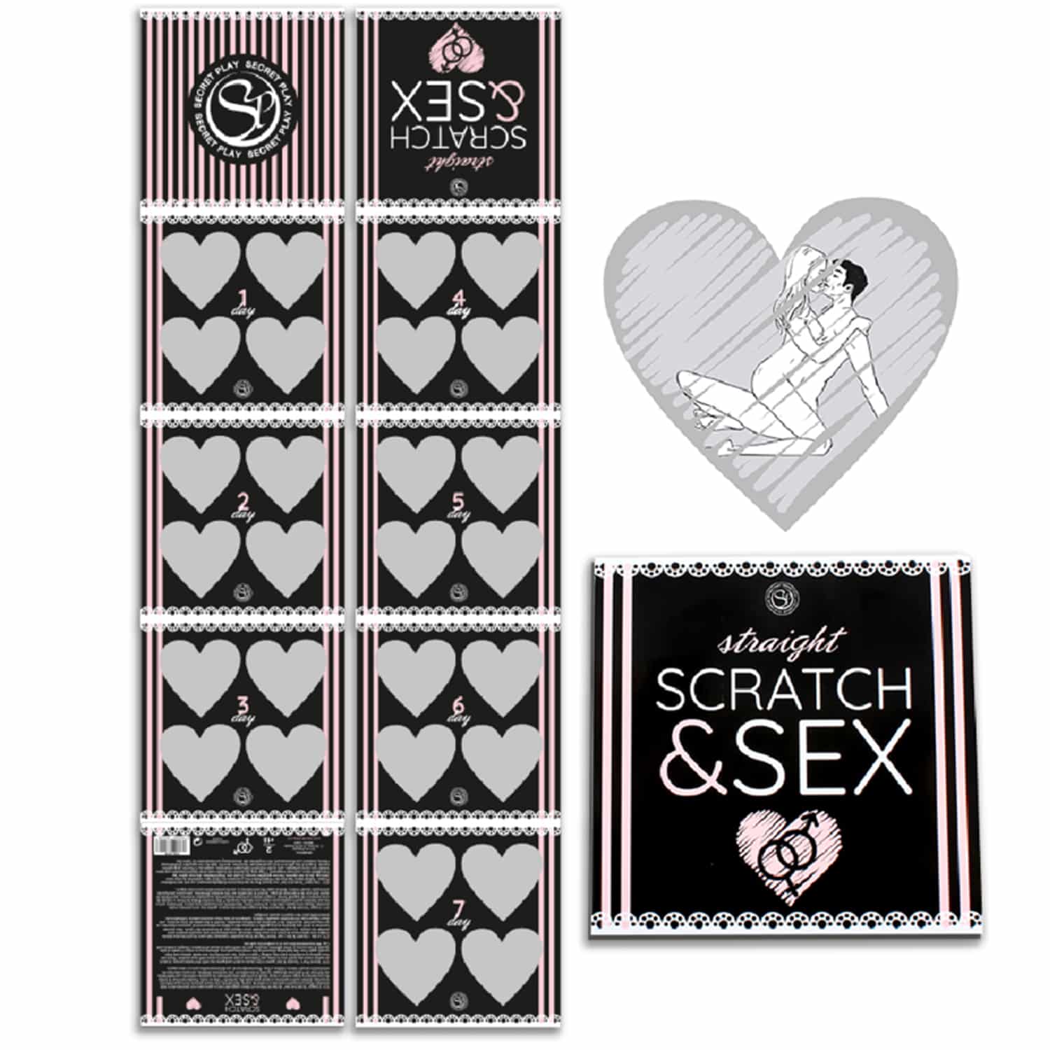 Du kan avsluta en veckas batch och sedan skrapa igen från början och upptäcka de återstående positionerna, vilket gör att du kan njuta av 4 veckors spel. Scratch & Sex finns i tre olika versioner, en för varje typ av sexuell läggning. Det här spelet är inriktad för Sexuella läggningen: Straight (heterosexuell)